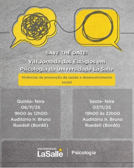 NOVEMBRO 2025 VIII Jornada dos Estágios em Psicologia DATA: 06 a 07 de novembro de 2025LOCAL: Universidade La Salle | Canoas (RS) INFORMAÇÕES: Evento presencial e gratuitoE-MAIL CONTATO: WHATSAPP: Inscrição Instagram Compartilhe: