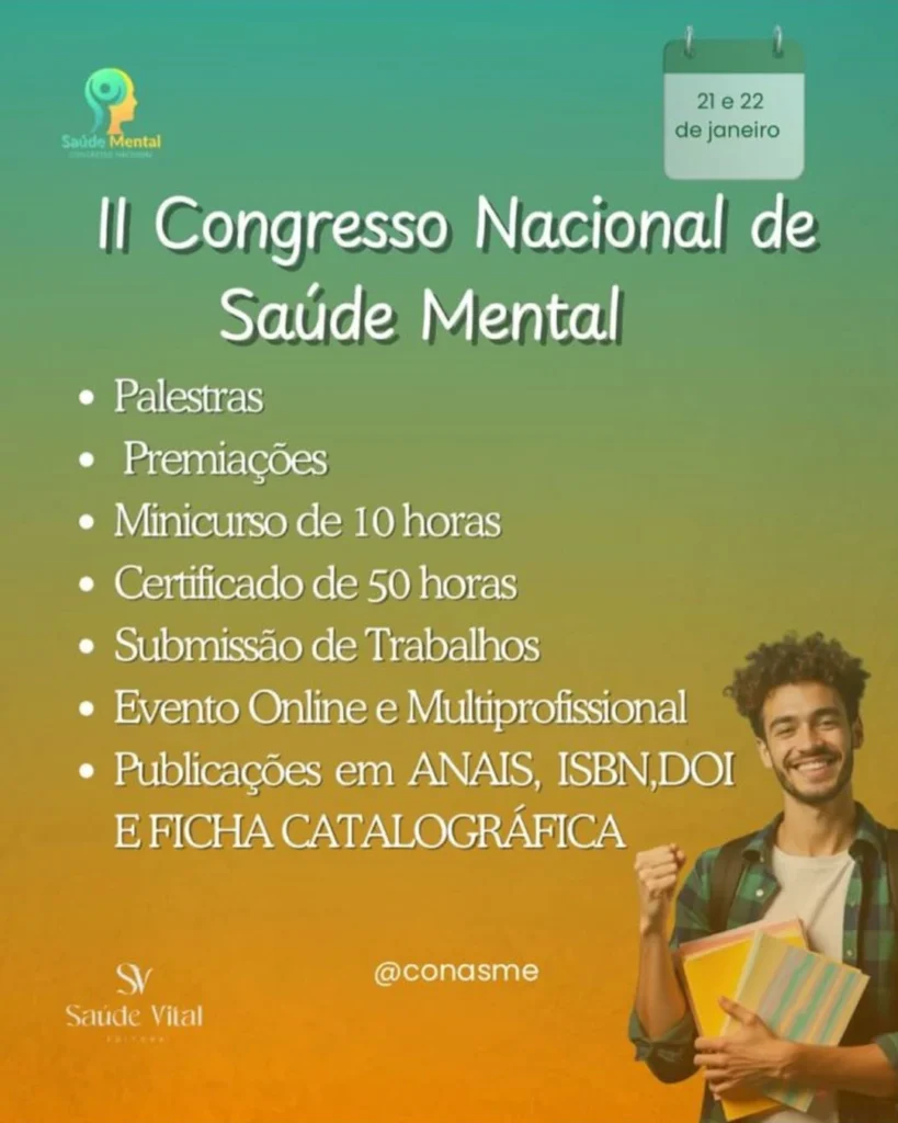 JANEIRO 2026 Voltar à página inicial II Congresso Nacional de Saúde Mental DATA: 21 a 22 de janeiro de 2026LOCAL: Editora Saúde VitalINFORMAÇÕES: Evento online com taxa de inscriçãoE-MAIL CONTATO: WHATSAPP: Inscrição Instagram Compartilhe: