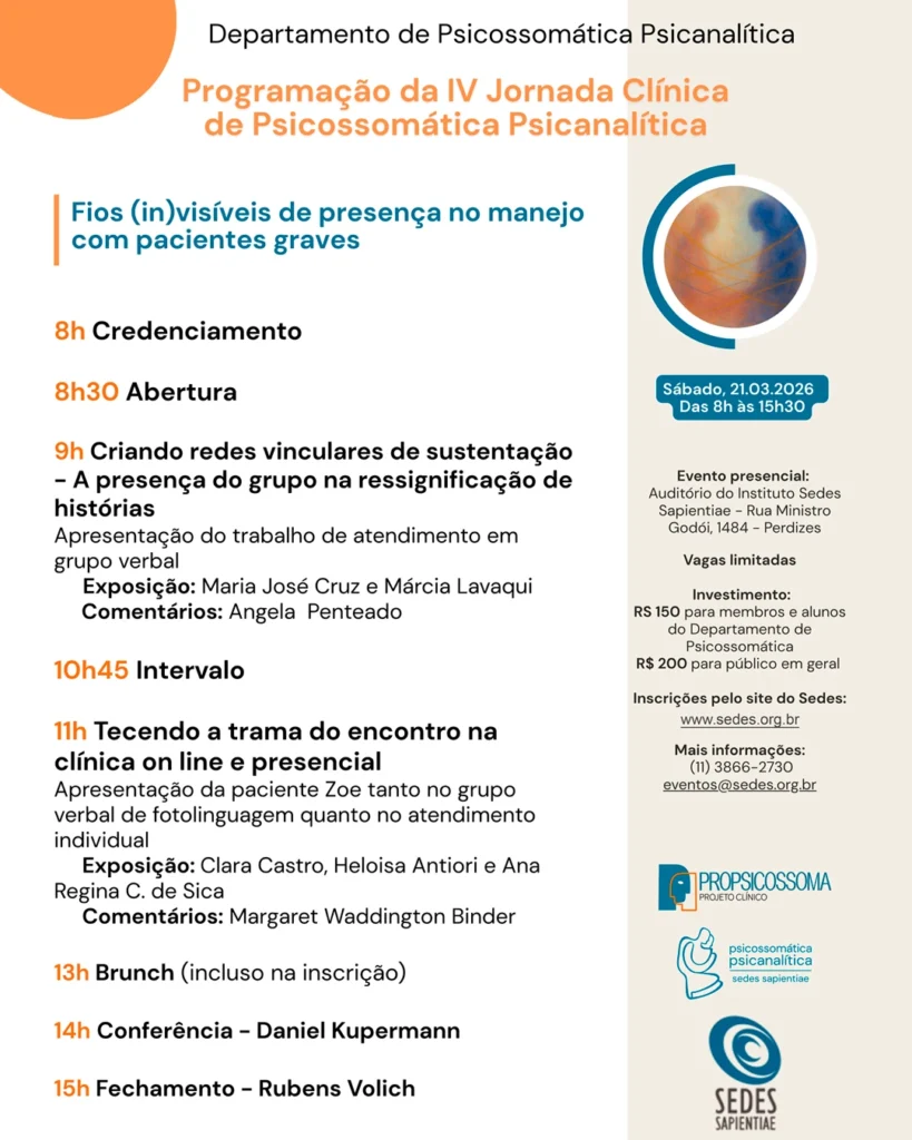 MARÇO 2026 Voltar à página inicial IV Jornada Clínica de Psicossomática Psicanalítica DATA: 21 de março de 2026LOCAL: Instituto Sedes Sapientiae | São Paulo (SP)INFORMAÇÕES: Evento presencial com taxa de inscriçãoE-MAIL CONTATO: eventos@sedes.org.brWHATSAPP: Inscrição Instagram Compartilhe: