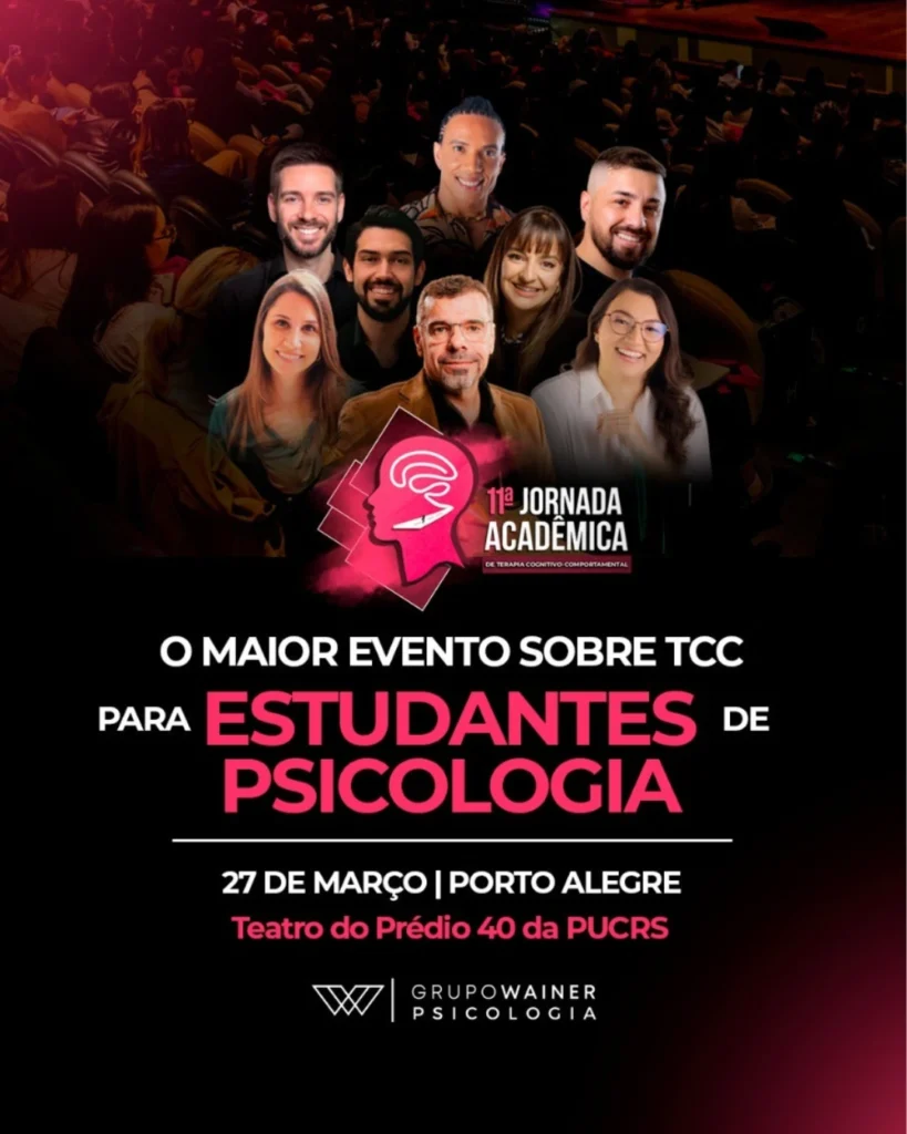 MARÇO 2026 Voltar à página inicial 11º Jornada Acadêmica de TCC da Wainer Psicologia DATA: 27 de março de 2026LOCAL: Teatro do Prédio 40 – PUCRS | Porto Alegre (RS)INFORMAÇÕES: Evento presencial com taxa de inscriçãoE-MAIL CONTATO: eventos@wainerpsicologia.com.brWHATSAPP: 51 91155142 Inscrição Instagram Compartilhe:
