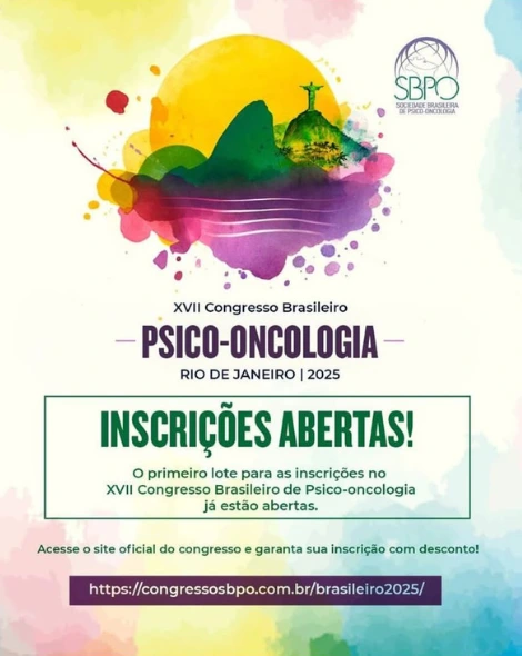 NOVEMBRO 2025 XVII Congresso Brasileiro de Psico-Oncologia DATA: 6 a 08 de novembro de 2025LOCAL: Rio de Janeiro (RJ)INFORMAÇÕES: Evento presencial com taxa de inscriçãoE-MAIL CONTATO: congresso2025@sbpo.org.brWHATSAPP: Inscrição Instagram Compartilhe: